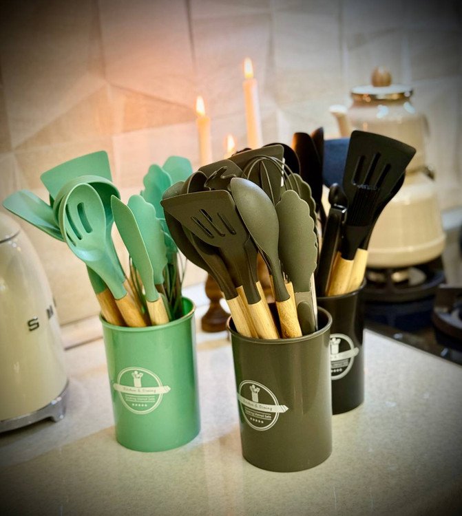 دارای ۷کفگیر و چنگال و ملاقه،انبر سالاد،فرچه و همزن سیلیکونی و دسته چووووب بامبو